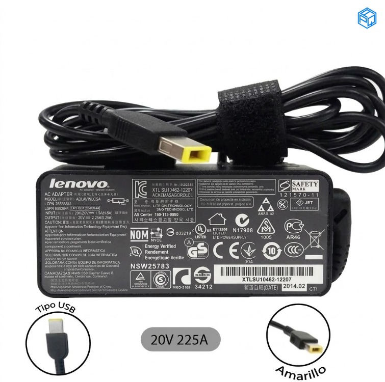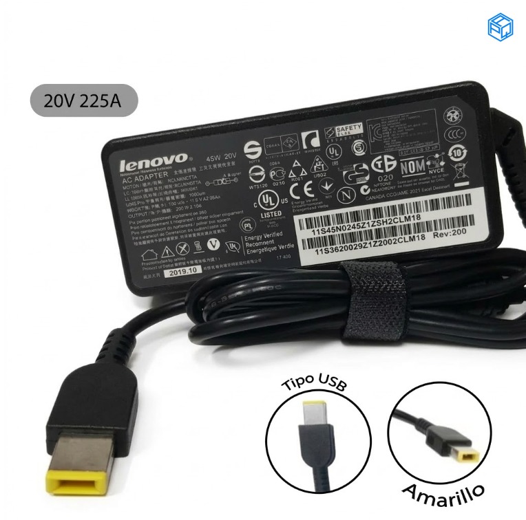 Cargador Compatible Lenovo 20V 2.25A / 45W – Conector USB Amarillo (Slim Tip)