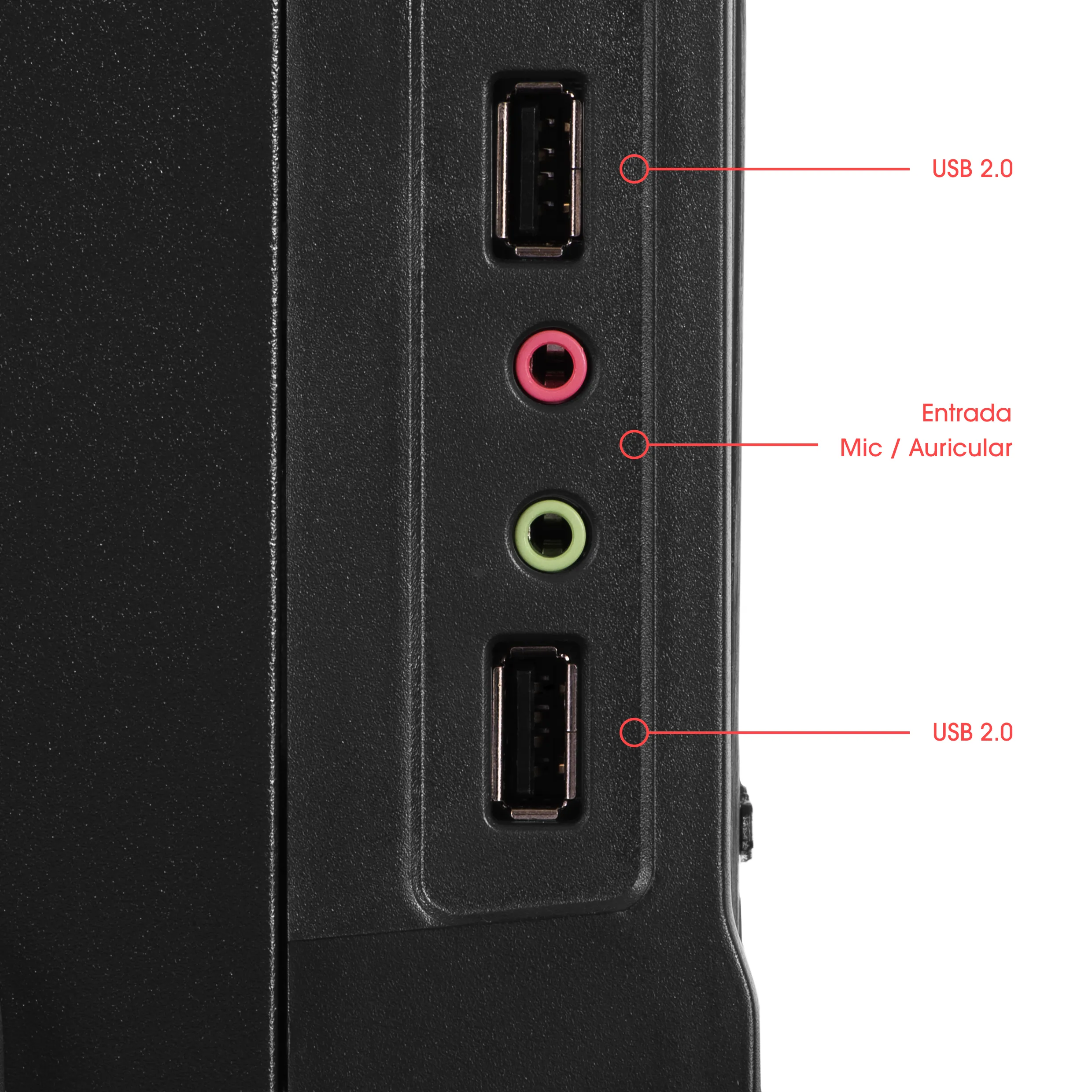 Puertos frontales: 2x USB 2.0, HD Audio, Mic, Auriculares, Power