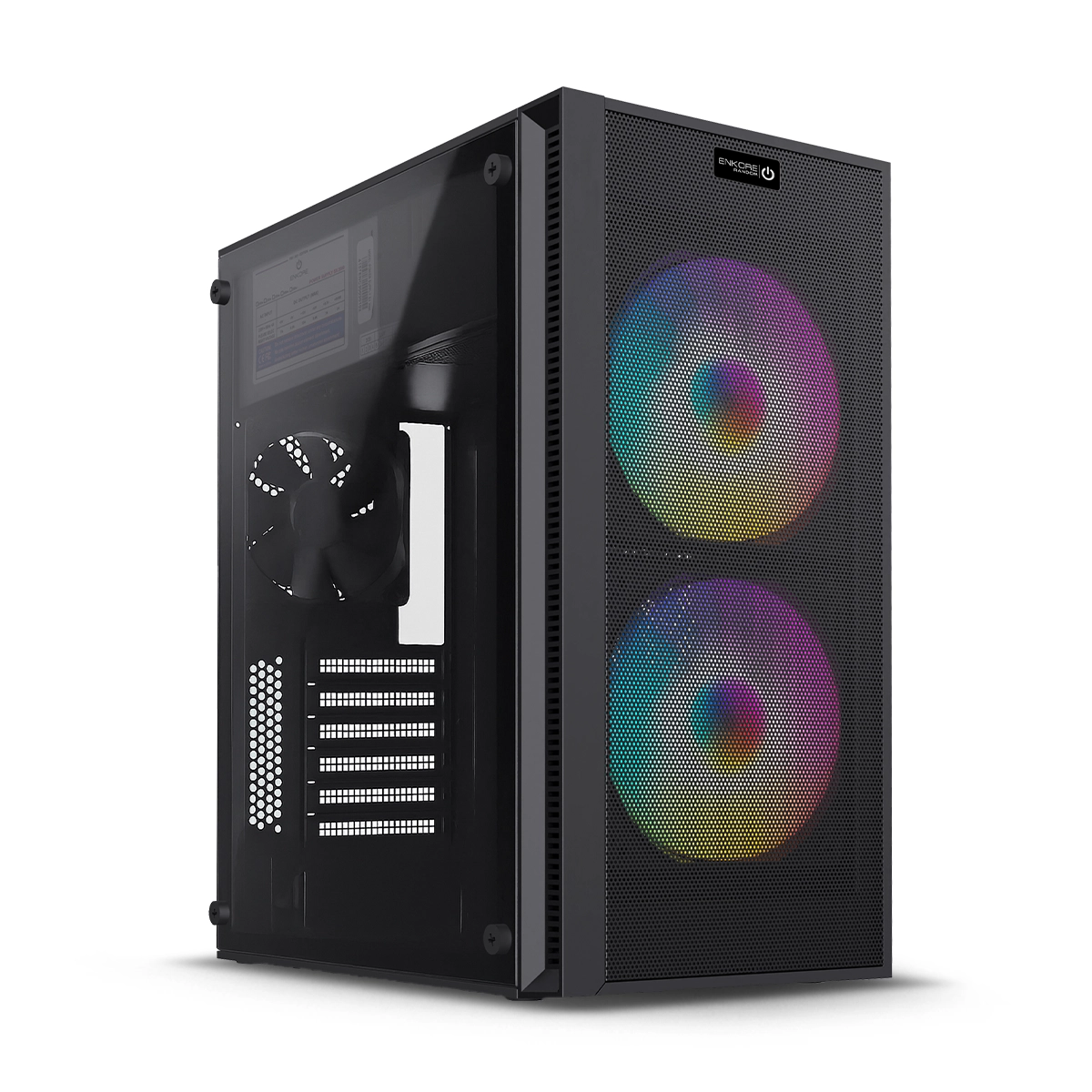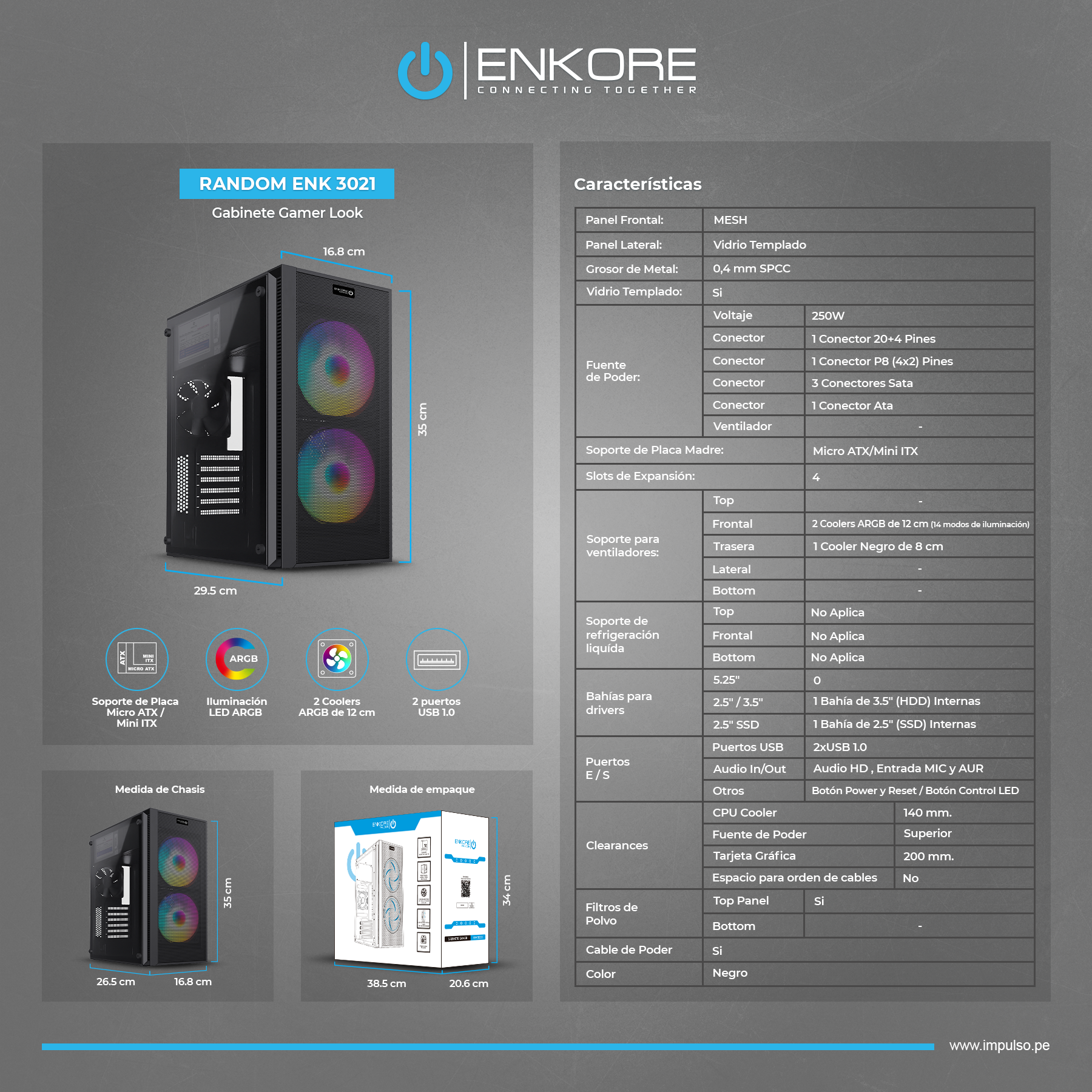 El RANDOM ENK 3021 de Enkore es un gabinete compacto de entrada diseñado para PCs básicas o de bajo presupuesto. Su principal atractivo es que ya viene con fuente de poder de 230W y ventiladores preinstalados (2 ARGB frontales de 120 mm y 1 trasero de 80 mm), lo que lo convierte en una solución práctica para quienes buscan armar un setup económico con estética gamer.