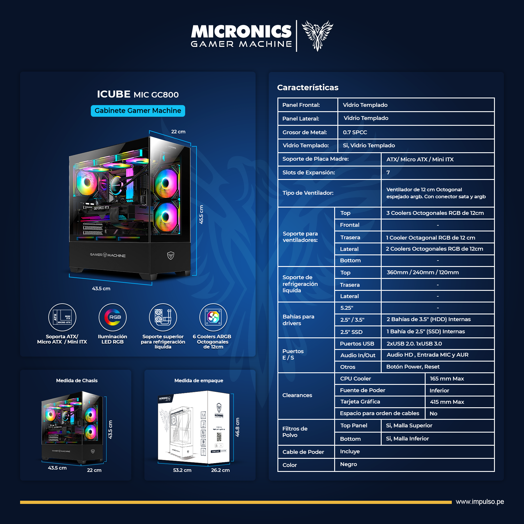 El Case ICUBE MIC GC8000 combina diseño y rendimiento en un chasis robusto con paneles de vidrio templado y una estructura metálica de 0.7 mm SPCC. Ideal para configuraciones gamer de alto rendimiento, ofrece amplio espacio interno, excelente ventilación y soporte para refrigeración líquida de hasta 360 mm. Su iluminación RGB Octogonal integrada en múltiples ventiladores brinda una estética moderna y dinámica.